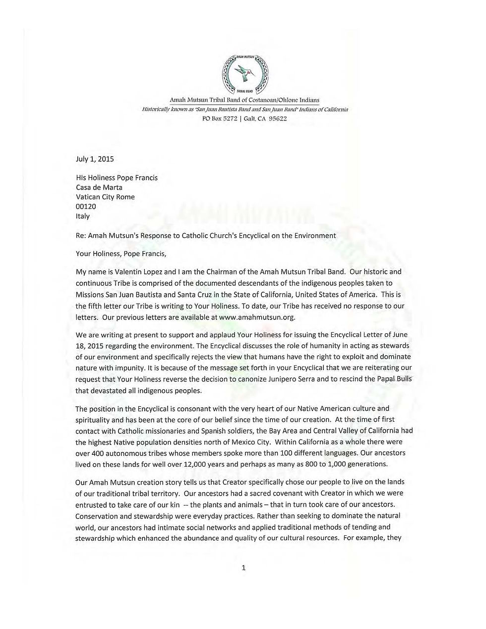 Letter to Pope Francis by Valentin Lopez, Chairman Amah Mutsun Tribal Band
